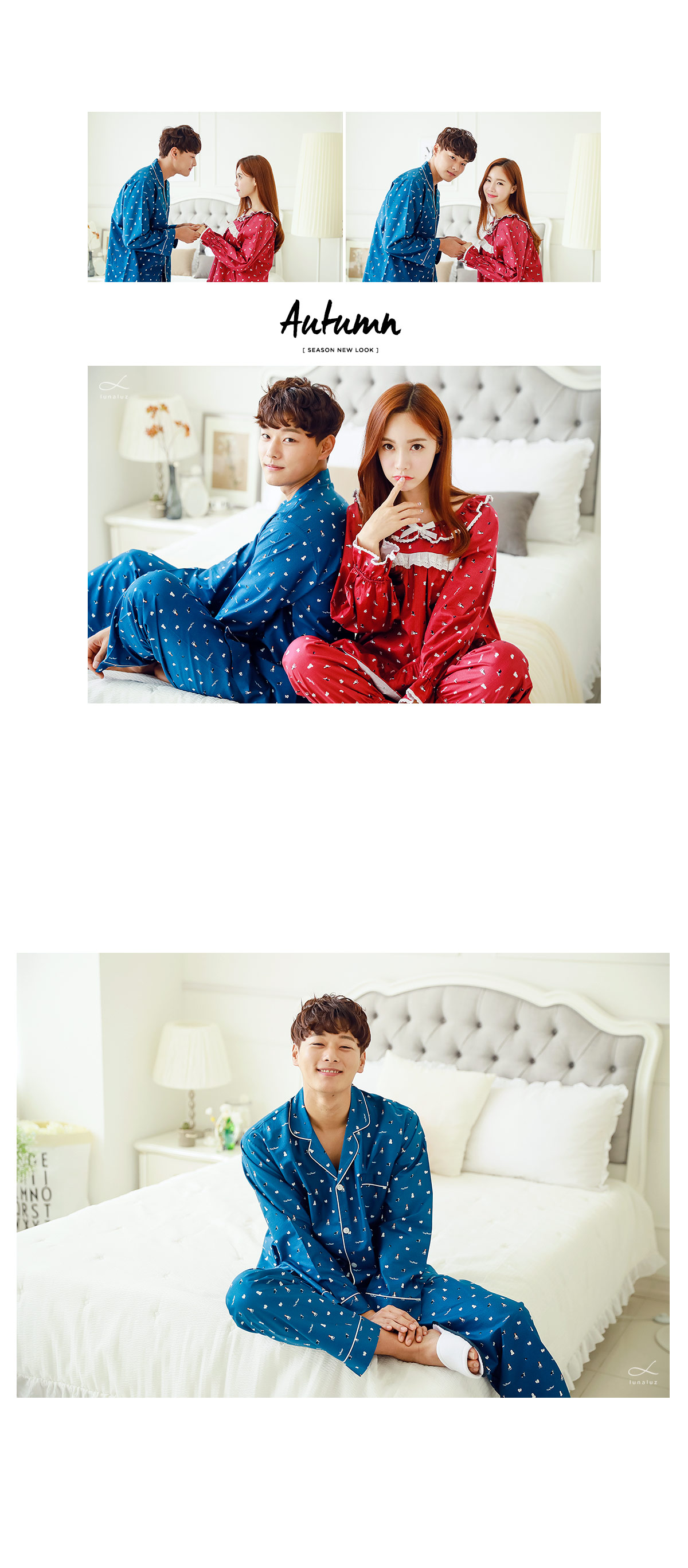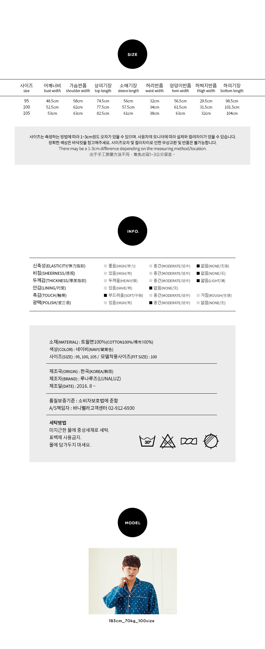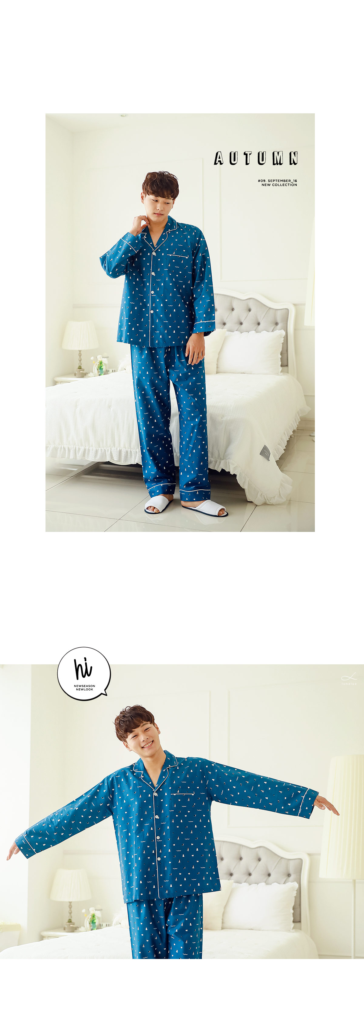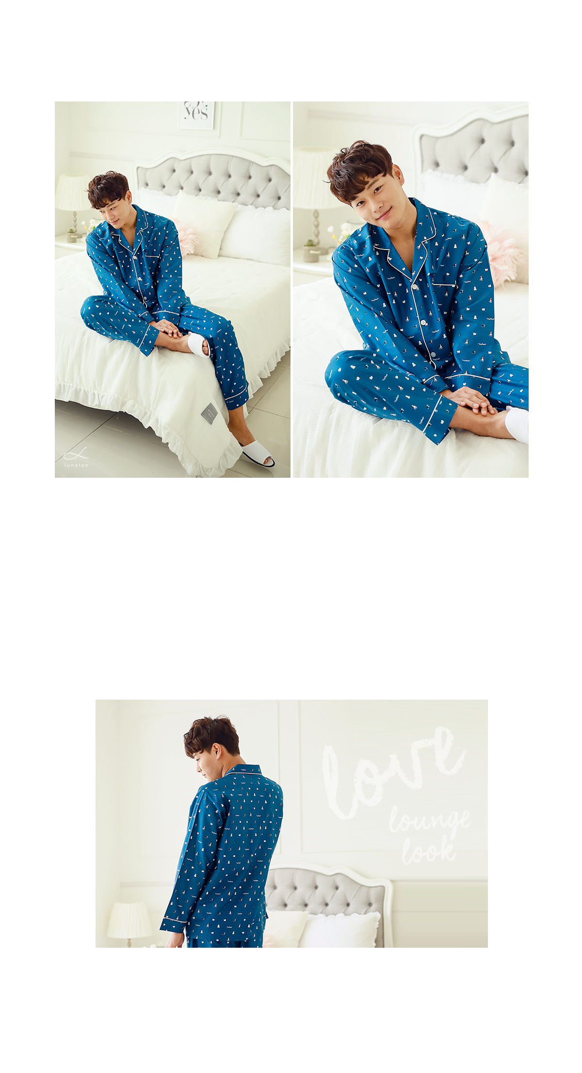 분위기 있는 네이비 베이스 위에 지문을 깔아 밋밋하지 않고 더욱 고급스럽게 내어주었습니다. 그 위에 귀여운 강아지 프린팅으로 포인트를 주었는데요. 포인트 되어주는 프린팅까지 고급스러우면서 분위기까지 살려주니 더 더~ 추천해드리고 싶습니다~! 카라넥으로 제작하고 아이보리컬러 삥줄을 둘러주어 깔끔하게 포인트를 주었습니다. 소매 부분과 팬츠의 하단에도 삥줄을 둘러주어 더 예뻐요. 전체적으로 고급스러우면서 발랄한 느낌을 주는 디자인과 디테일입니다.^^ 커플로 입어도 더욱 예쁘게 연출된답니다. 원단에 고급스러운 광택이 살짝살짝 돌고 피부에 닿는 느낌이 좋아 숙면을 취하시기 좋습니다. 100% 국내 제작으로 내구성과 퀄리티가 좋습니다.