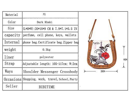 Product Description BIBITIME Hollow Leaves Paris Flower Print Beach Shoulder Crossbody Messenger Bag Cross Body Bag Travel Bag for Holiday Back to School University /College Campus Bag Shopping Hobo Bag University /College Campus BACK TO SCHOOL Season Fashion Casual Bag Size(L*H*W): 20 * 18 * 9 CM 7.87 * 7.09 * 3.54 IN (Defined size is normal, please mainly in kind) Adjustable shoulder strap Length: 105-117cm, Width: 2cm Color:Blue.Black.Pink.Dark khaki.Dark brown (Defined color is single, please mainly in kind) Material: PU Liner:Polyester Popular elements:paris tower flower Function: women handbag,women shoulder bag, women messenger bag, women crossboday bag Intended Use:crossbody bags for travel(cross body bag women travel,cross body bag women pu leather);crossbody bags for girls ,messenger bag for women for college,messenger bag for teens girls for school, handbags for teen girls,shoulder bags for school for teen girls Package include: 1 X messenger bag for women cross body bag (Does not include Other Accessories Usually shipping time is 7-25 working days ,please ignore system shipping time) Notes: 1. Please allow 1-2cm (0.4-0.8 in) differences due to manual measurement, thanks. 2. Item color displayed in photos may be showing slightly different on your computer monitor since monitors are not calibrated same. About Return Policy 1.We accept returns and exchanges within 7 days for any reason, if you are not satisfied with the items you received. Please note that the return shipping cost will be on you party. We will process your return request within 4-6 days after we received the returned item. 2.Please to contact with us immediately for the replacement or repairing,if the item you received is defective. if replacement is not available, please give us a picture as evidence, we will refund you. 0