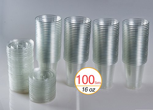 16 oz Plastic Clear Drink PET Cups with Flat Lids, 100 Sets