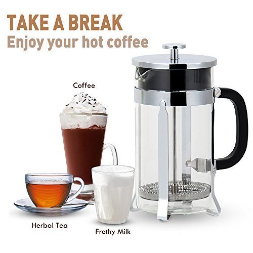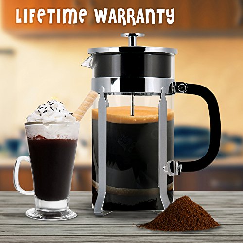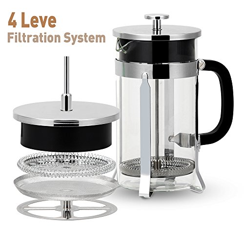 PERFECT FILTER TO GIVE INDELIBLE FLAVOR. Perfected French press coffee maker with its unique TWO-FILTER SYSTEM & A SECONDARY FILTER at the lid that yields a richly flavored, grit-free cup every time! This affordably priced coffe plunger combines super-durable GERMAN BOROSILICATE GLASS with a Chrome Plated frame and lid. The press coffee maker or french press for tea uses two filters, the first 8-times finer and the second 13-times finer than other French press, micro-filtering the coffee twice