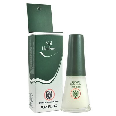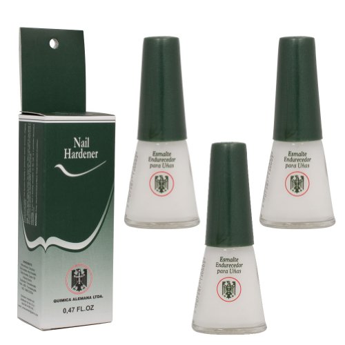 Studio : Quimica Alemana Publisher : Quimica Alemana Binding : Misc. Product Description Quimica Alemana Nail Hardener .47 oz Bottle (3 Pack) - Quimica Alemana Nail Hardener is a unique nail treatment formulated to strengthen and repair thin brittle nails. Quimica Alemana Nail Hardener can be applied like a base coat, before you apply nail polish. Quimica Alemana utilizes a highly concentrated formula for repairing nails and should only be applied in a thin coat, no more than once per week. This extraordinary treatment will make your nails visibly healthier and stronger in as little as 1 to 3 weeks of use! Details 47 oz Bottle, Strengthens weak nails, Prevents Pealing Chipping, Results in as little as 1 Week. Instructions: Step 1:Shake well and apply to clean and dry nails. (Tip: Apply from the center of the nail down to the tip) Step 2:If using like a base coat, make sure nails are completely dry before covering with polish. Suggested Use:Apply a thin coat once a week for the first three weeks. Suggested Use after 3 WeeksNow cover the entire nail with a thin coat once per week. (Do not apply more than once a week). WARNING:If you feel pain, burning or persistent discomfort, remove immediately and suspend the use. Avoid contact with cuticles and skin. Product is NOT meant for daily use. Keep out of reach of children. Use in ventilated areas. 0