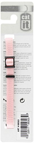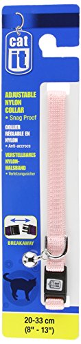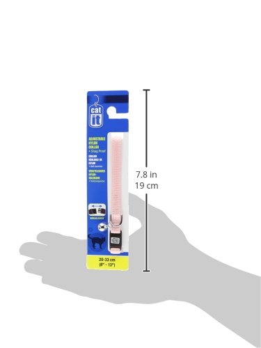 Studio : Catit Publisher : Catit Binding : Misc. Product Description This adjustable cat collar comes with plastic breakaway snap buckle, bell and D-ring for attaching leash and identification tags. The quick-release safety snap releases the collar to allow your cat to free itself should the collar become caught in bushes, fences, etc. Made from snag-proof nylon weave that will not shrink or tighten when snagged or scratched by cat. Available in pink color. Packaged on backer card. To find the correct collar size for your cat, measure around your cat's neck then add 2-inch. Made of nylon material. Measures 8-13-inch length by 3/8-inch width. This product weighs 0.1-pound. 0