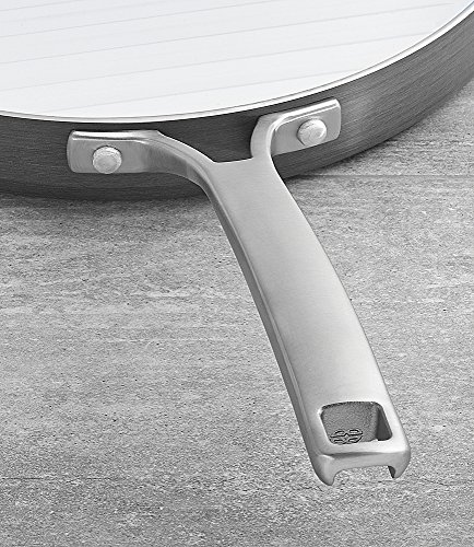 Save time in the kitchen with the Calphalon Classic Ceramic Nonstick 12-Inch Round Grill Pan, featuring , PFOA-free ceramic nonstick for extra-easy food release and cleanup. This nonstick grill pan is constructed from durable hard-anodized aluminum for fast and even heating and has a long, stay-cool stainless steel handle. The round stovetop grill pan is ideal for stovetop grilling and searing - it's ideal for chicken breasts, hamburgers, sandwiches and vegetables. The ridged surface adds authentic grill marks and helps drain fat while you're cooking.Feature