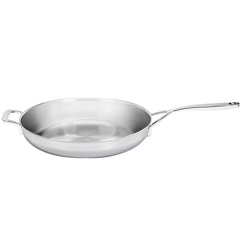 Produced in Belgium, Demeyere 5-Plus cookware is constructed of five layers: an 18/10 stainless-steel interior that won't react with foods, three layers of fast-heating aluminum and a magnetic stainless-steel base that's compatible with induction burners. Pans heat up quickly, distribute heat evenly and retain it well for perfect searing, browning and frying. Unlike other cookware on the market, these pans have a flat, stable base that won't bulge when heated, ensuring even cooking. Ergonomic handles stay cool on the stovetop, tight-fitting lids promote energy-efficient cooking, and rolled rims prevent spills when pouring. The cookware is oven and broiler safe to 500F (260C).Feature