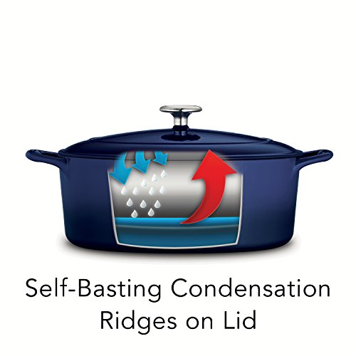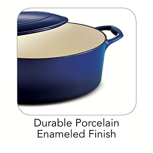 The enameled cast-iron 5.5 qt covered oval dutch oven is part of Tramontina's Gourmet collection of premium products engineered and manufactured with the finest design, materials and workmanship, outperforming similar products within the market and delivering the best quality and value to the cooking professional and enthusiast alike. Prized by cooks for heat retention and even cooking, this enameled cast-iron 5.5 qt covered oval dutch oven will deliver heat slowly so your braised pork chops and chicken-sausage chili serve up incredibly moist and flavorful, as the self-basting condensation ridges on lid uniformly collect and direct vapors onto food. The oval dutch oven also produces outstanding cobblers, Irish soda bread and baked desserts. Sturdy side handles make for secure lifting and transferring of the Tramontina enameled cast-iron dutch oven to your table. The heavy-gauge cast-iron covered oval dutch oven cooking surface is coated with off-white, smooth and easy-to-clean PFOA- and PTFE-free porcelain enamel. Offered in a vibrant, gradated porcelain enamel exterior finish for an elegant kitchen to table serving option. Hand-wash only, compatible with all cooktops and oven-safe to 450 F. This product is assembled and packaged in USA and offered under a lifetime warranty.Feature