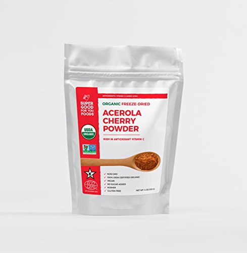 -. Feature : Certified 100% Organic, Vegan, Gluten-free, Non-GMO, Kosher / No added sugar, Low-glycemic, Freeze-dried for nutrient preservation / Acerola cherries are exceptionally high in vitamin C, carotenoids, and other antioxidants / Add a tropical sweet-sour taste to any drink, dessert, or use in jams & jellies