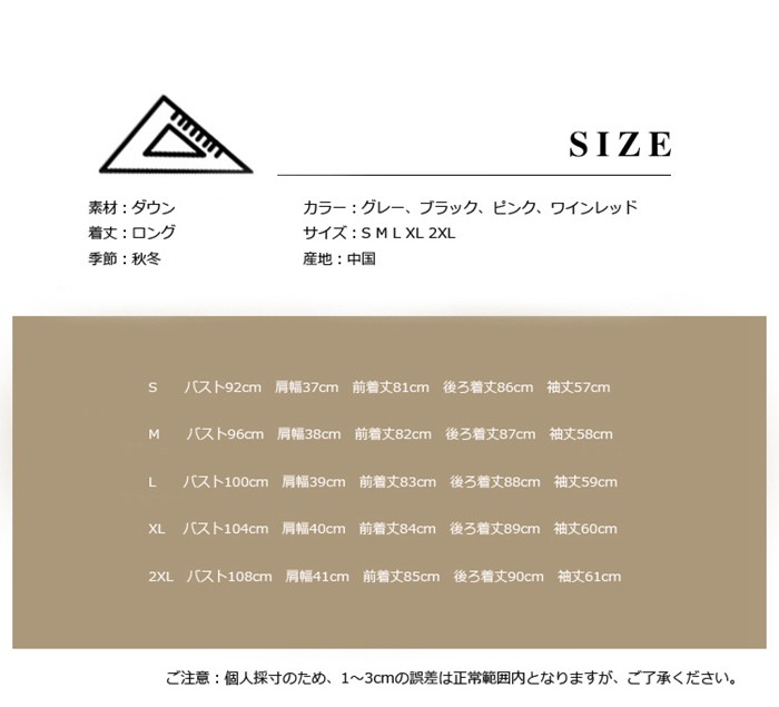 ダウンコート レディース ダウンコート Aライン 軽い ダウンジャケット 大きいサイズ レディース 上品 ラクーンファー 2016秋冬新作 ダウンジャケット 大きいサイズ レディース アウター ロング商品詳細素材:ダウン着丈:ロング季節:秋冬カラー:グレー、ブラック、ピンク、ワインレッドサイズ:S M L XL 2XL産地:中国サイズ参照表S バスト92cm 肩幅37cm 前着丈81cm 後ろ着丈86cm 袖丈57cmM バスト96cm 肩幅38cm 前着丈82cm 後ろ着丈87cm 袖丈58cm L バスト100cm 肩幅39cm 前着丈83cm 後ろ着丈88cm 袖丈59cm XL バスト104cm 肩幅40cm 前着丈84cm 後ろ着丈89cm 袖丈60cm2XL バスト108cm 肩幅41cm 前着丈85cm 後ろ着丈90cm 袖丈61cmご注意:個人採寸のため、1~3cmの誤差は正常範囲内となりますが、ご了承ください。ダウンコート レディース ダウンコート Aライン 軽い ダウンジャケット 大きいサイズ レディース 上品 ラクーンファー 2016秋冬新作 ダウンジャケット 大きいサイズ レディース アウター ロング