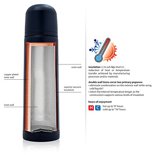 Compact Design and lightweight (18.5 ounces) makes for a very packable easy to carry hydration vessel. Durable construction makes this thermal bottle virtually unbreakable, leak proof and rust proof. No chemical leeching or metal taste and an advanced scientifically designed copper plated inner wall for superior insulation.