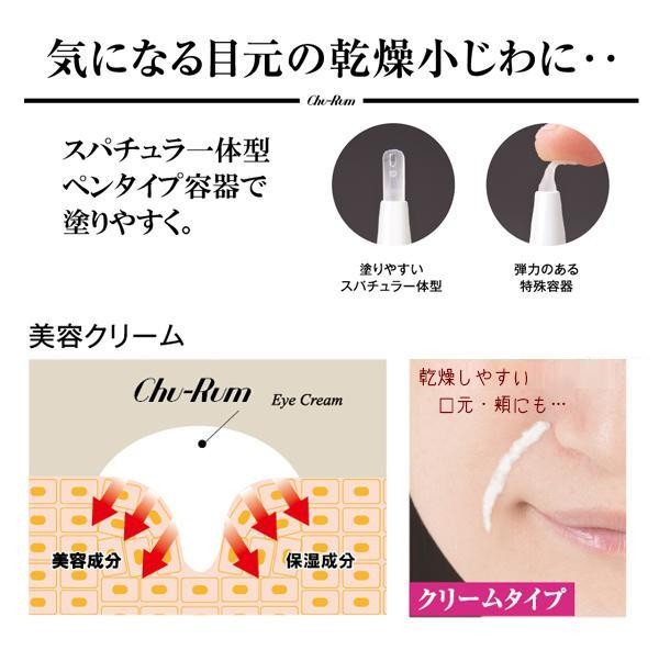 ハリと潤いのこだわり美容成分が、気になる乾燥小じわに浸透(角質層まで)し、集中ケア!!スパチュラ一体型ペンタイプ容器で塗りやすく、目元だけでなく、口元のケアにもお使いいただけます♪塗ってマッサージするクリームタイプ。 |