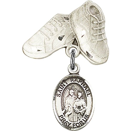 -. Title : Sterling Silver Baby Badge with St. Raphael the Archangel Charm and Baby Boots Pin 1 X 5/8 inches