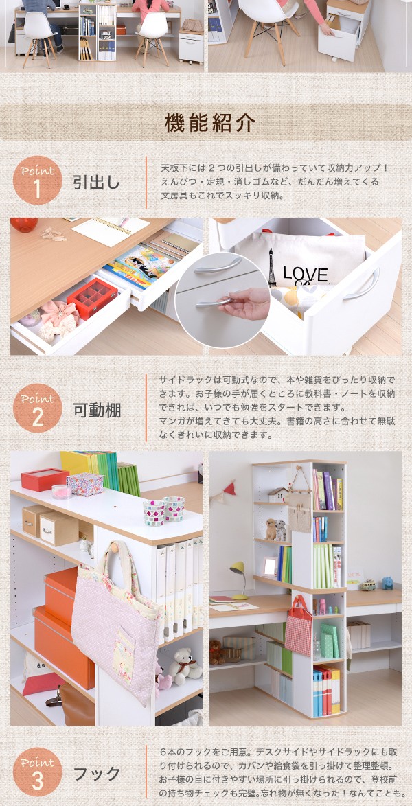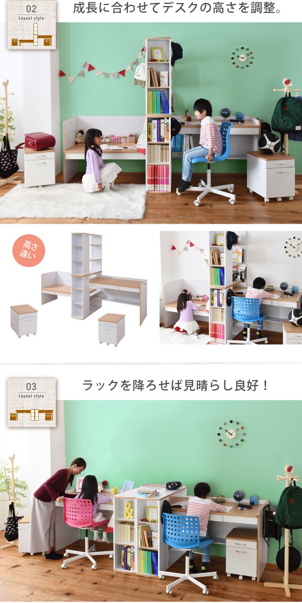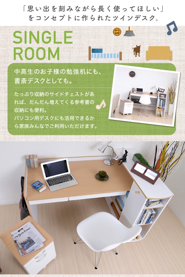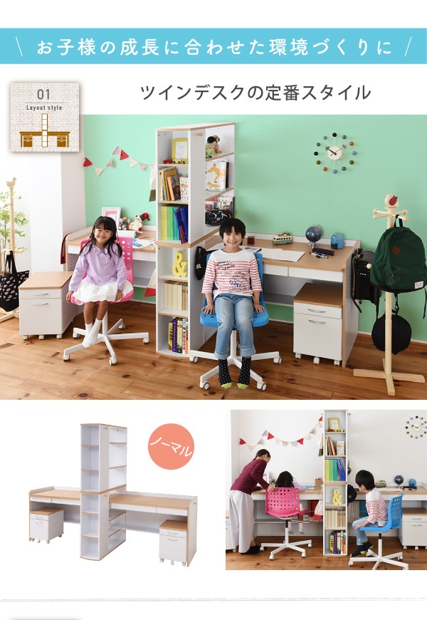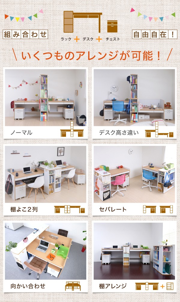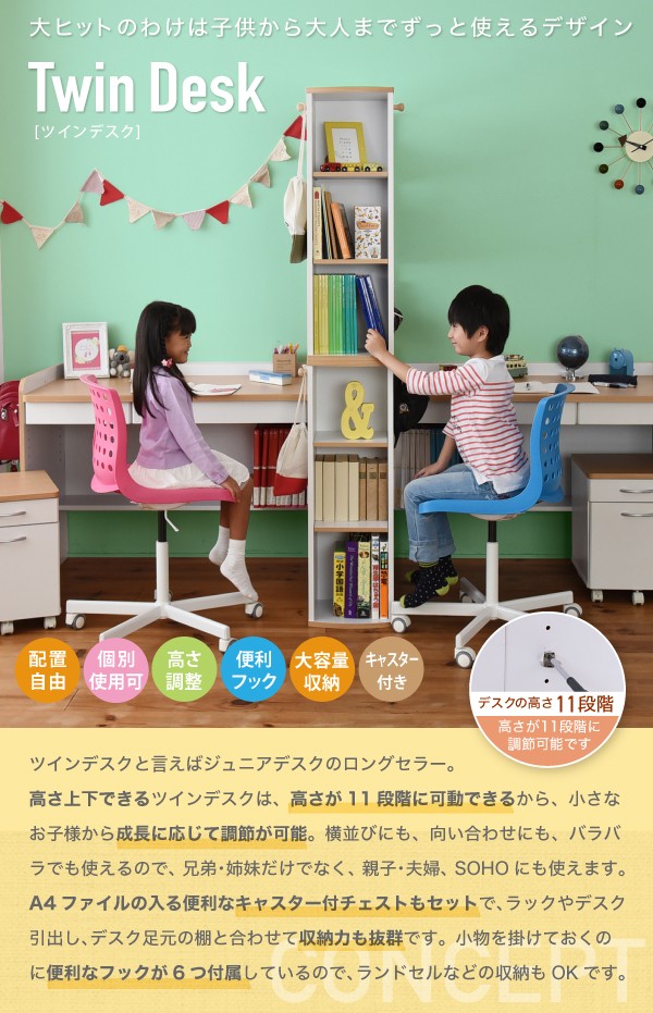 ■商品説明 ツインデスクと言えばジュニアデスクのロングセラー。高さ上下できるツインデスクは、高さが11段階に可変できるから、小さなお子様から成長に応じて調節が可能。横並びにも、向い合わせにも、バラバラでも使えるので、兄弟・姉妹だけでなく、親子・夫婦、SOHOにも使えます。A4ファイルの入る便利なキャスター付チェストもセットで、ラックやデスク引出し、デスク足下の棚と合わせて収納力も抜群です。小物を掛けておくのに便利なフックが6つ付属しているので、ランドセルなどの収納もOKです。■本体サイズ [外寸]幅252.0×奥行90.5×高さ180.0cm(デスク単体)幅145×奥行90.5×高さ90.0cm(チェスト)幅35.5×奥行41.5×高さ47.0cm(ラック)幅37.5×奥行90.5×高さ90.0cm■組立時間(目安)(大人2人) お客様組立(150分)■キーワード 高さ調節 高さ調整 ジュニアデスク 学習デスク 学童デスク キッズデスク 多機能デスク 学習机