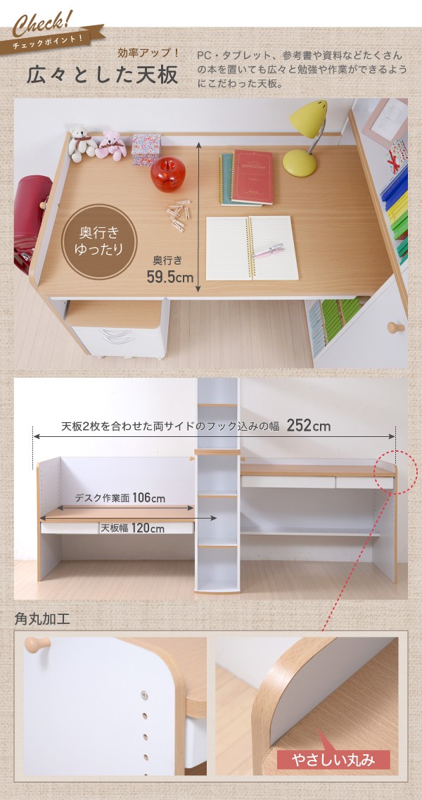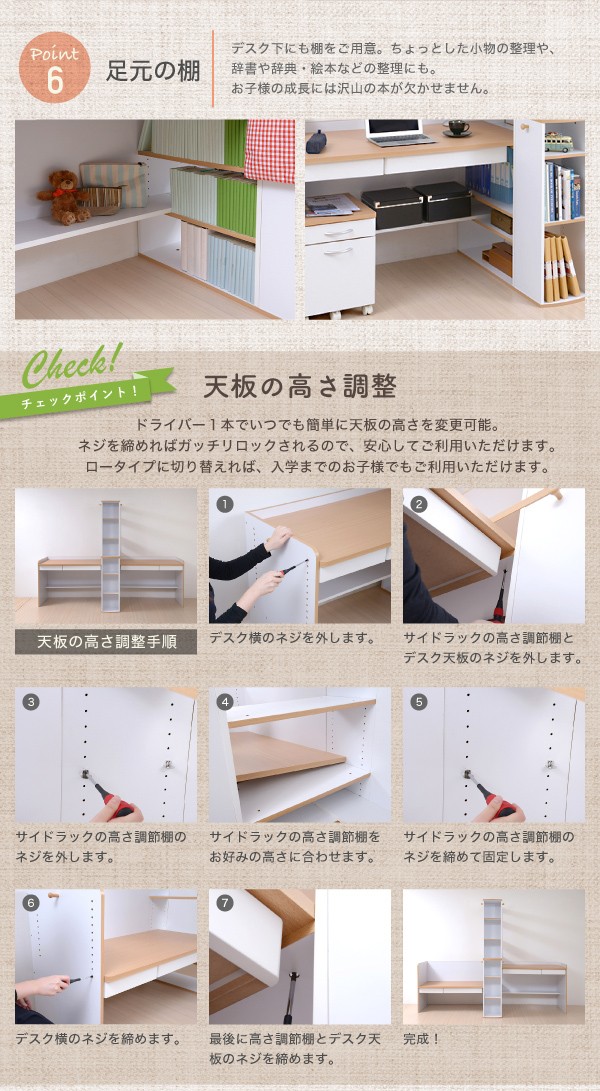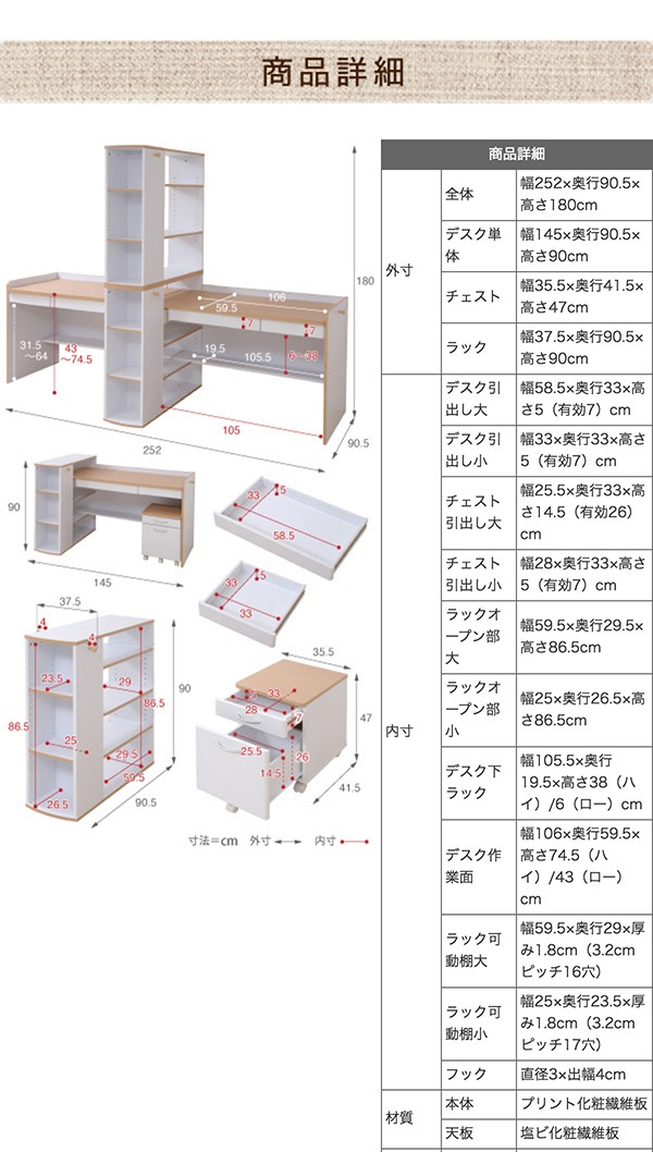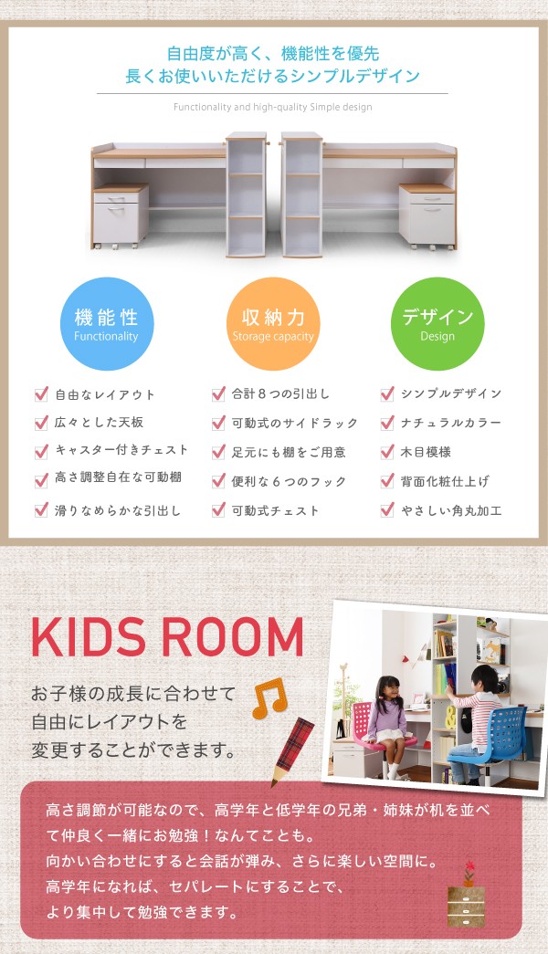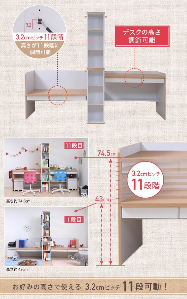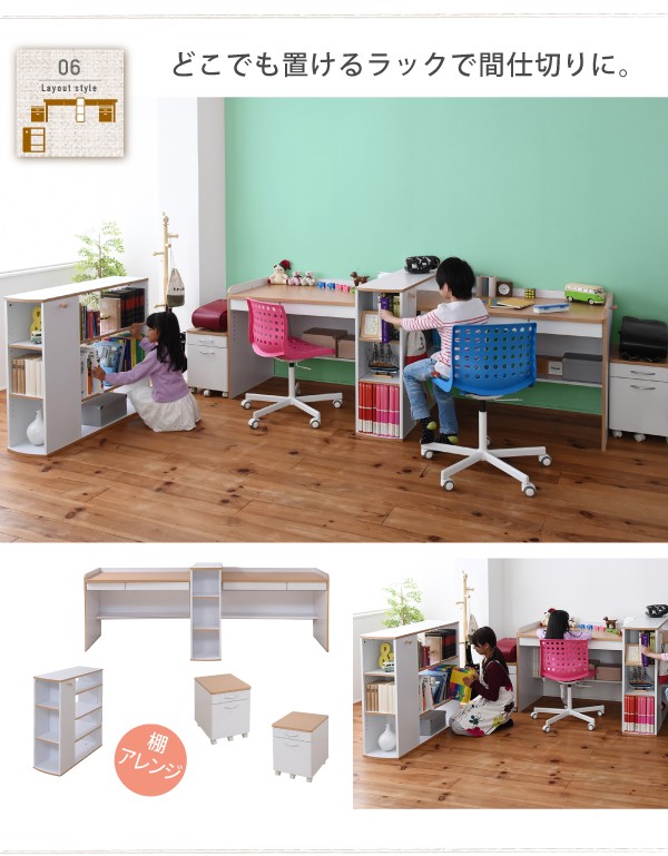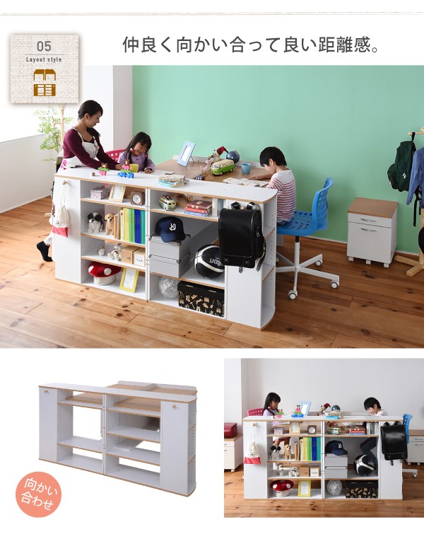■商品説明 ツインデスクと言えばジュニアデスクのロングセラー。高さ上下できるツインデスクは、高さが11段階に可変できるから、小さなお子様から成長に応じて調節が可能。横並びにも、向い合わせにも、バラバラでも使えるので、兄弟・姉妹だけでなく、親子・夫婦、SOHOにも使えます。A4ファイルの入る便利なキャスター付チェストもセットで、ラックやデスク引出し、デスク足下の棚と合わせて収納力も抜群です。小物を掛けておくのに便利なフックが6つ付属しているので、ランドセルなどの収納もOKです。■本体サイズ [外寸]幅252.0×奥行90.5×高さ180.0cm(デスク単体)幅145×奥行90.5×高さ90.0cm(チェスト)幅35.5×奥行41.5×高さ47.0cm(ラック)幅37.5×奥行90.5×高さ90.0cm■組立時間(目安)(大人2人) お客様組立(150分)■キーワード 高さ調節 高さ調整 ジュニアデスク 学習デスク 学童デスク キッズデスク 多機能デスク 学習机