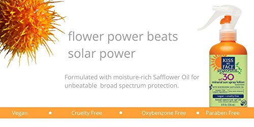 -. Feature : Practice safe sun with this Vegan & Cruelty Free, non-nano mineral formula blended with nourishing Safflower Oil. / Broad Spectrum spf30 protection & Water Resistant for 80 minutes. When used properly, mineral sunscreens will leave a whitish tint. / NSF Certified Organic formula is made with 73% organic ingredients - also has a convenient twist & lock trigger spray. / Vegan, Cruelty Free, Oxybenzone Free, Paraben Free, Gluten Free & Phthalate Free. Leaping Bunny Certified. / Kiss My Face. Kiss it & make it better.
