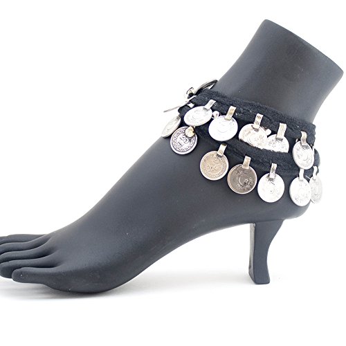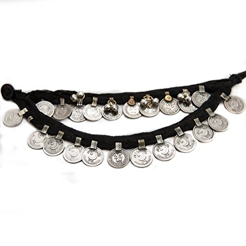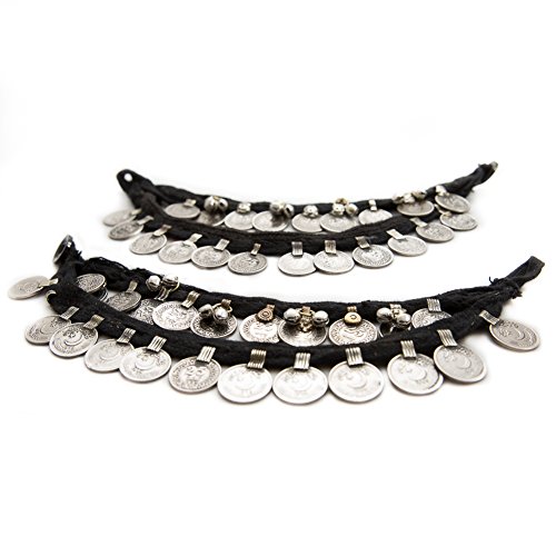 -. Title : Bohemian Gypsy Kuchi Fabric Anklet Cuff Pair with Afghani Coins and Soft Bells