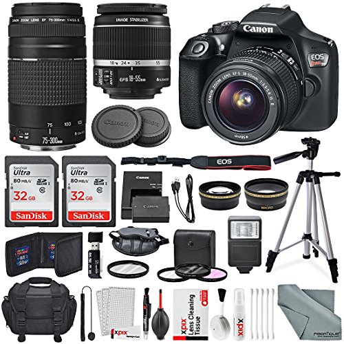 Accessory bundle contains an EF-S 18-55mm f/3.5-5.6 IS II Lens, EF 75-300mm f/4-5.6 III Lens, Deluxe shoulder bag, 2 X 32GB memory cards, 58mm 2.2x telephoto professional lens, Pro Series HD 58mm wide angle lens, 3 Piece 58mm filter kit (UV/FLD/CPL) digital ultraviolet filter, card reader/writer, wrist grip strap, Xpix 8pc. Cleaning Kit ,air dust blower, 2 in1 cleaning pen, universal manual flash, 57” tripod, fibertique cleaning cloth,