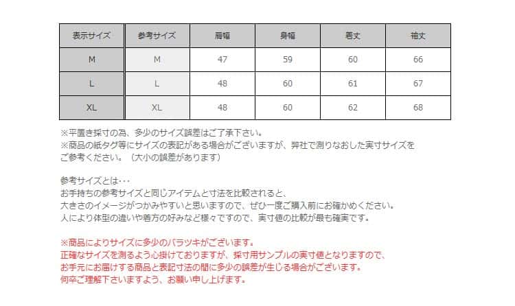 【サイズ】 参考サイズ / 肩幅 / 身幅 / 着丈 / 袖丈