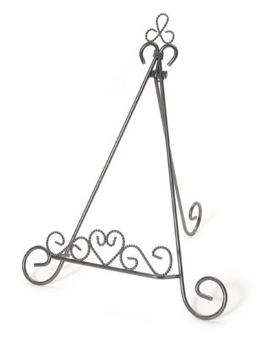 -. Feature : Gracefully curved stand to display photos, books, small artwork, collector plates & more! / 10 inches tall metal iron with a folding rear leg. / Heart wire scroll pattern on support arm extend out approx. 1-1/8". / Great to showcase your favorite items ranging from 6" to 13" tall / 8" wide x 10" high.