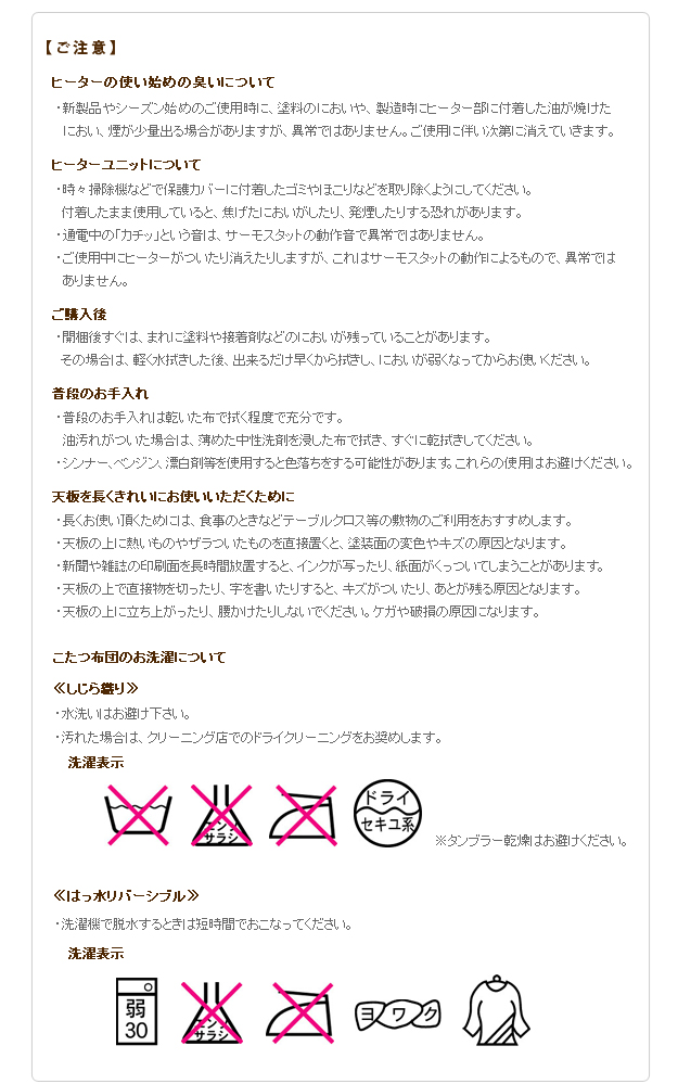 ●材質:こたつ天板-天然木化粧繊維板(楢)、こたつ幕板・脚部-天然木(ラバーウッド)、椅子本体-天然木(ラバーウッド)、布団表地-しじら/綿100%、レンガ・ベージュ/ポリエステル100%(撥水フランネル)