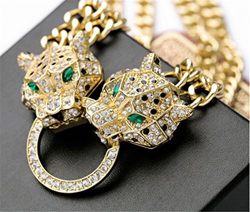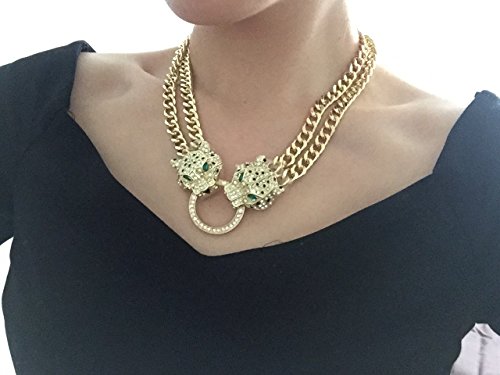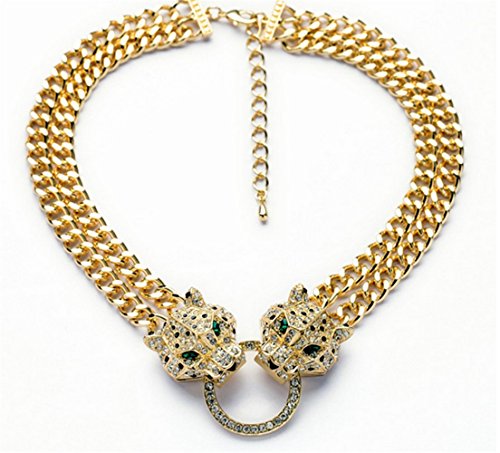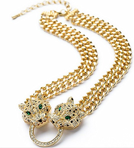 P.phoebus 18K Vintage Leopard Head Yellow Gold Green Eyes Choker Statement Bib Necklace