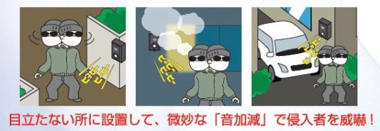 センサーが侵入者を感知すると、小さなアラーム音が鳴ります。 目立たないところに設置して、微妙な『音加減』で侵入者を威嚇!防犯ジャリと同じような効果! 取り付け簡単:マグネット/両面テープ/木ネジ 音量調節可能:40dB/73dB/86dB 防飛沫仕様IP44、屋外軒下等(直接雨がかからない場所)で使用可能。 |