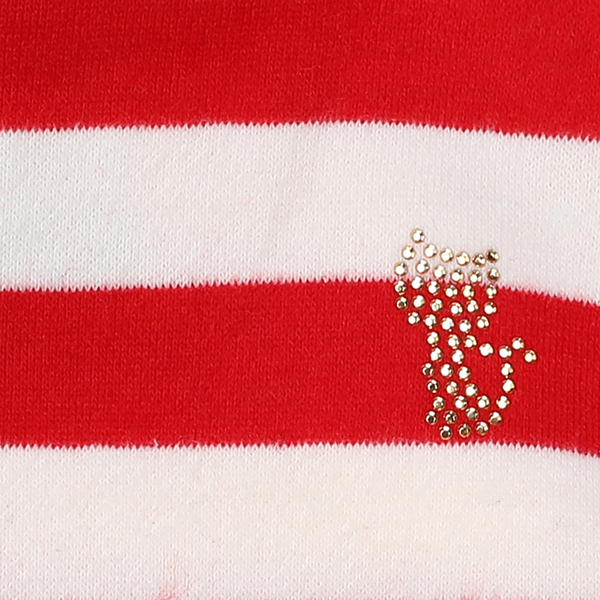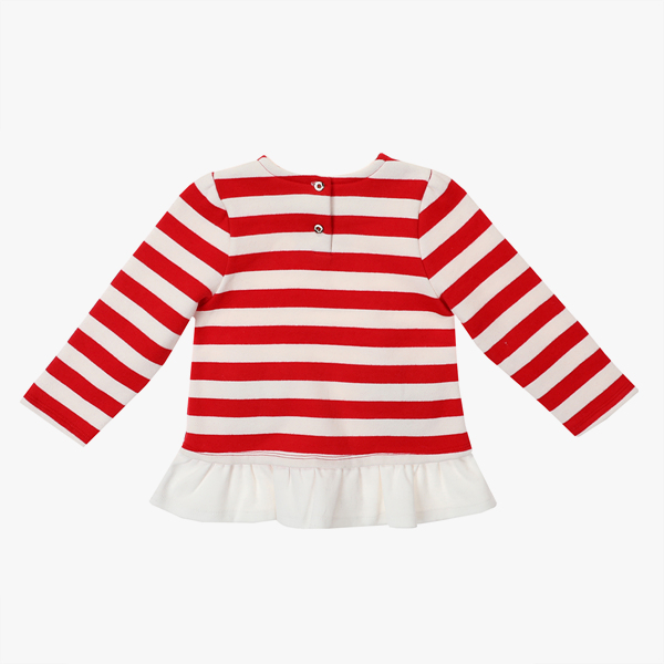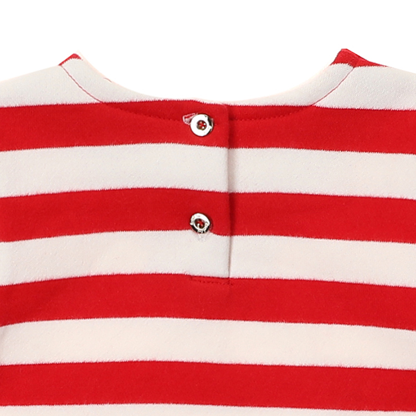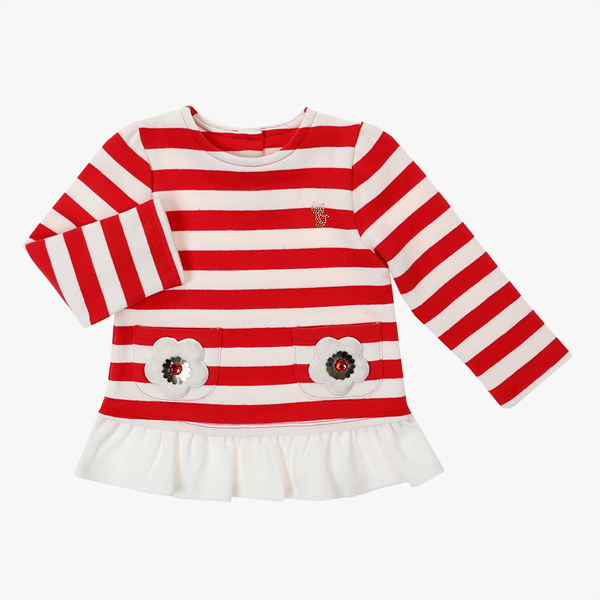 상품설명 레드 스트라이프 패턴의 롱티셔츠 입니다. 밑단에 화이트 프릴단이 큐트함을 더했으며, 앞 포켓 꽃자수와 장식보석이 러블리합니다. 네이비배색 레깅스 또는 아이보리 배색레깅스와 코디하셔도 좋습니다.