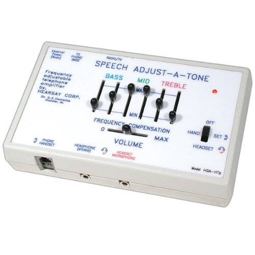 Studio : HearSay Publisher : HearSay Binding : Health and Beauty Product Description Enjoy clearer sound during telephone conversations or when listening to the TV, radio, tape recorder or a computer sound card. In addition to the abilities of the basic HGA-TP unit, the Speech Adjust-A-Tone HGA-HTP can also be used with a headset with a boom microphone while using the telephone. The Speech Adjust-A-Tone is more than amplification. Six adjustable frequency ranges can adapt to each person's particular hearing loss and thus aid in speech discrimination as well as amplification. While listening to television, radio, tape recorder or computer sound card, the hearing impaired user wears a headset (not included) and can adjust the volume control and frequency controls for optimum clarity. A neckloop or bone conducting transducer (neither included) can also be used. Others in the room are not disturbed. It can be used with the old style carbon microphone or the newer electret microphone equipped phone sets. Most standard headphones with miniature stereo phone plugs will work with this unit. Headphones need not be worn when the device is used with the telephone, but may be beneficial in some cases. The HGA-TP includes a Telephone Receiver Cord, a 9 Volt Battery and a 1 Year Repair or Replace Warranty. 0