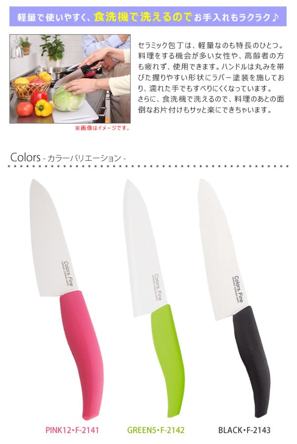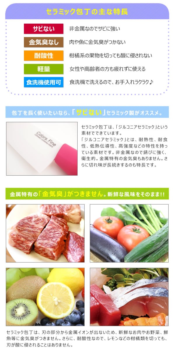 | セラミック製の刀身をもつ金属未使用の包丁です。金属につきものの錆びや金気臭がないので、快適にご使用いただけます!! |