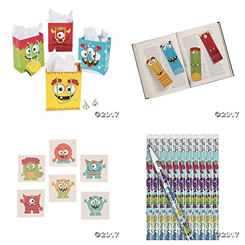 Funny MONSTER PARTY - 84 Pc FAVORS - 24 Bookmarks - 36 TATTOOS - 12 Mini GIFT Bags - 12 PENCILS - BIRTHDAY Parties HALLOWEEN Trick or Treat CLASSROOM