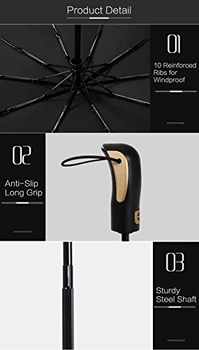 -. Feature : ★10-RIBS WINDPROOF CONSTRUCTION: Most compact travel umbrellas are made with 6 or 8 ribs but VILLASON is fortified with reinforced 10 ribs to avoid the chance of turning inside out. The umbrella won't break if inverted / ★COMPACT BUT LARGE WHEN OPEN: Our umbrella is small enough to fit in your bag; At 13 inches in closed length; it is a lightweight accessory, whether in a bag or in your hand. But when it is open, it is large enough for 1-2 people with 46 inches large canopy. / ★QUICK-DRYING: The fabric of canopy is super water repellent that make your umbrella repels water and dry fast. The water touches the umbrella surface will become small drops of water. / ★FAST AUTO OPEN AND CLOSE: One Second One Hand Operation. Don't wait another second to open the umbrella when you get out from your car in the rains, Especially Heavy Rains. / ★QUALITY MATERIALS: Umbrella canopy is made with 210T polyester and coated. Fortified frame is made with 10 durable fiberglass and aluminum alloy ribs. Long grip keeps the handle secure and slip-free in your hand.
