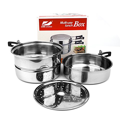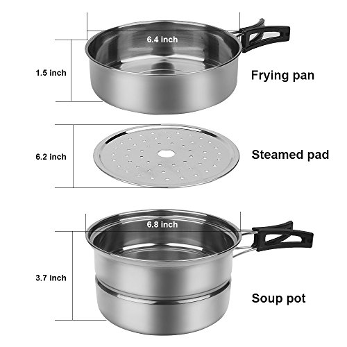 Specifications: Color: Silver Material: Stainless steel Size:Soup pot diameter:6.9 inch Height:3.8 inch. Frying pan diameter:6.5 inch Height:1.6 inch. Steamed pad diameter:6.3 inch Applicable scope:Perfect for 3~4 people