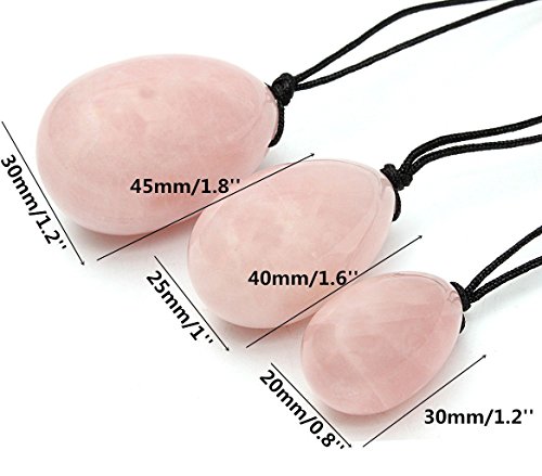 This 3-pcs rose quartz eggs set has everything you need for egg practices. 100% natural and genuine. Hand carved and polished with excellent workmanship. No any chemical treatment nor any waxing is used. Very safe. Many rose quartz crystals have cracking. It is a normal practice to use wax, either food grade or non food grade waxes, to fill the holes or cracking of inferior rose quartz crystals to hide the defects. We consider the waxing is an unsafe practice for yoni eggs, and never use any wax in our rose quartz yoni eggs. We select best quality rose quartz crystals that have no hole nor cracking for yoni egg making.