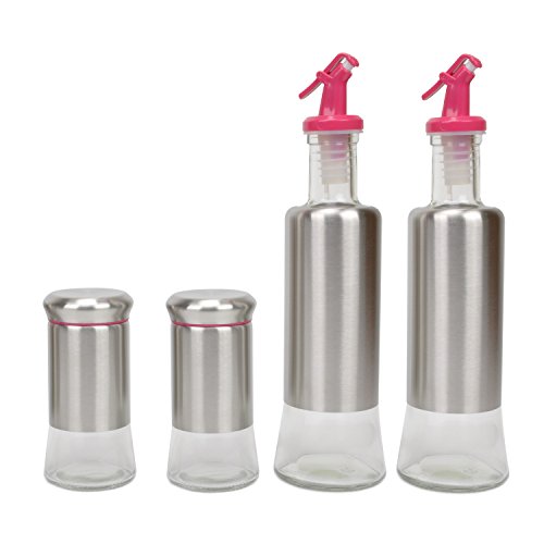 -. Title : Evelyne GMT-10200-R 4-Piece Stainless Steel Cruet Set Oil Vinegar Dispenser Spout Bottle Salt & Pepper Shaker (Pink)