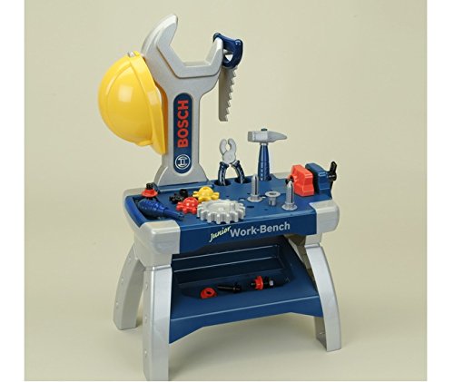 This Theo Klein Bosch Junior Workbench Play Set is a fun and engaging toy for aspiring carpenters. It stands over 27" tall and comes with a saw, hammer, vise, hand screwdriver, hardhat and pliers. Assorted nuts, bolts and spanners are also included. This Bosch workbench set is made from durable plastic materials and requires some assembly. Junior workbench set includes: Saw Hammer Pliers Vise Hand screwdriver Hardhat Nuts and bolts Spanners