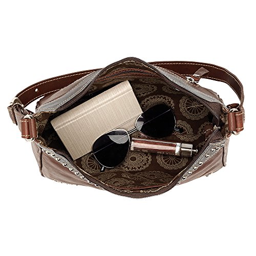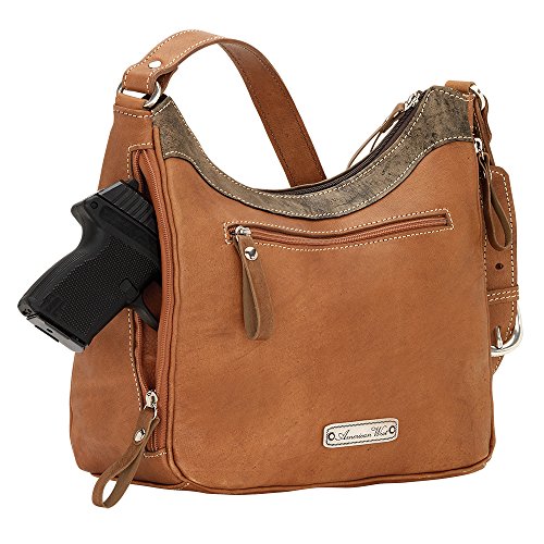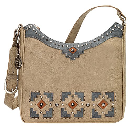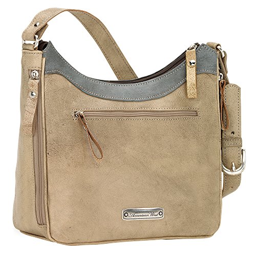 -. Brand : American West -. Color : Brown -. Department : womens -. EAN : 0671893059156 -. Model : 8252629 -. MPN : 8252629 -. PartNumber : 8252629 -. ProductGroup : Shoes -. ProductTypeName : HANDBAG -. Title : American West Annie's Secret Collection Shoulder bag with secret compartment - Sand / Denim Blue / Golden Tan -. UPC : 671893059156 Zip-top structured shoulder bag with an adjustable strap. Sand-colored genuine leather is hand cut and layered with denim blue and golden tan leathers to create a Southwestern pattern. Accented perfectly with smooth silver spots and antiqued silver spots. Back of bag has a zipper compartment. Inside has a zipper compartment and open pouches. Hidden back wall compartment has zipper openings on either side on the bag, and is lined in chrome leather. (pocket will fit barrel up to 6.5" and grip up to 5") Each handbag includes a signature keepsake and a protective storage bag. Each piece is made by hand, one at a time. This item is backed by the American West Lifetime Guarantee