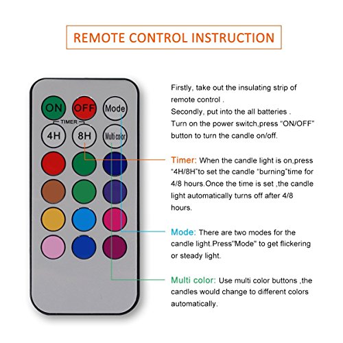 THE MULTI-PURPOSE REMOTE Control gives you the option to control the FLICKER, remote control candles you can set a 4-or-8 hour timer, and You will have 12 Glowing colors to choose from! You can also set them to rotate through the colors automatically
