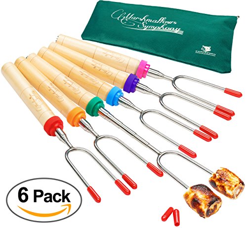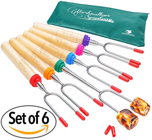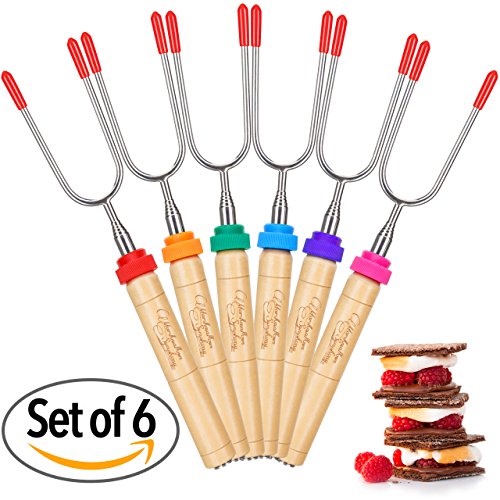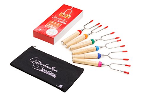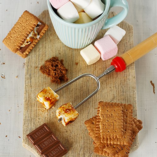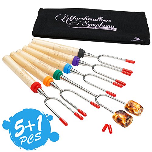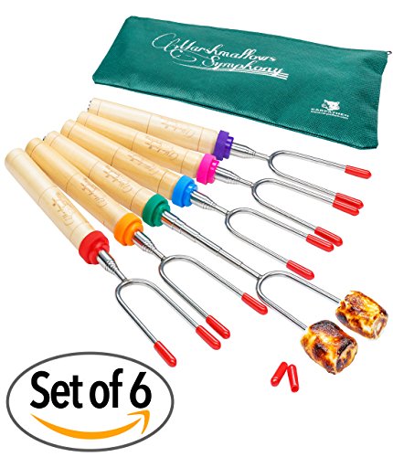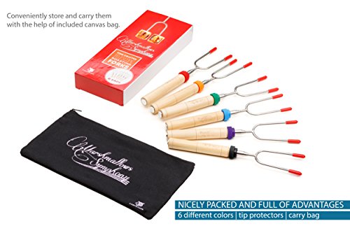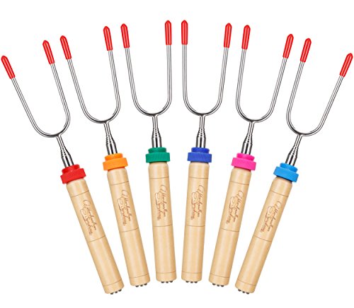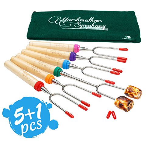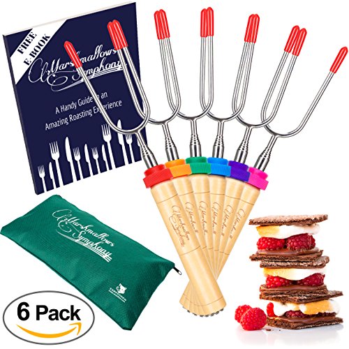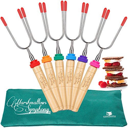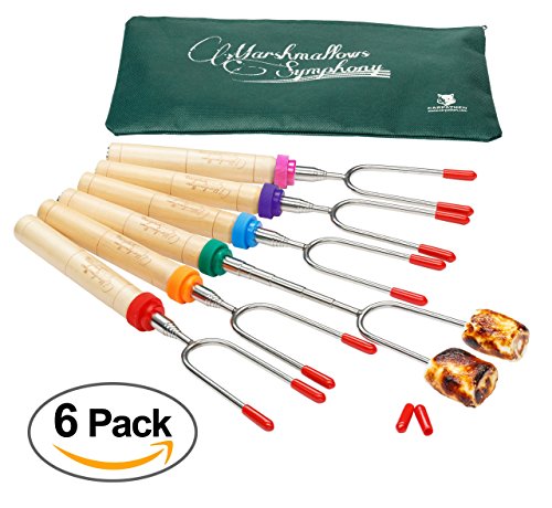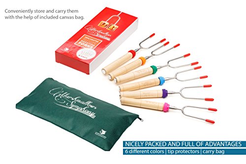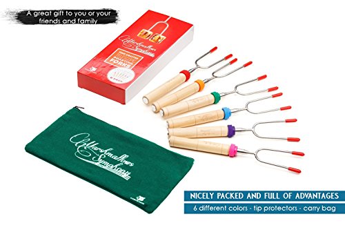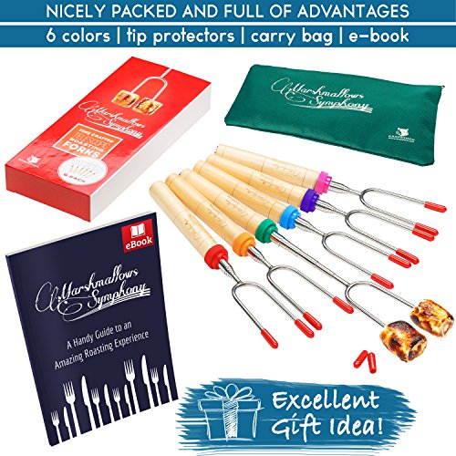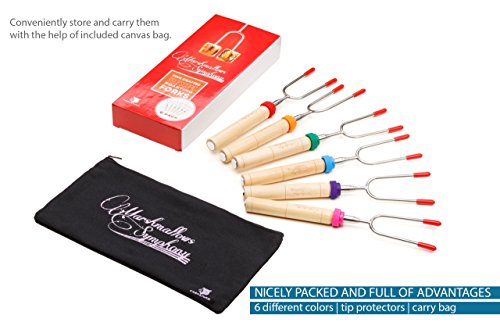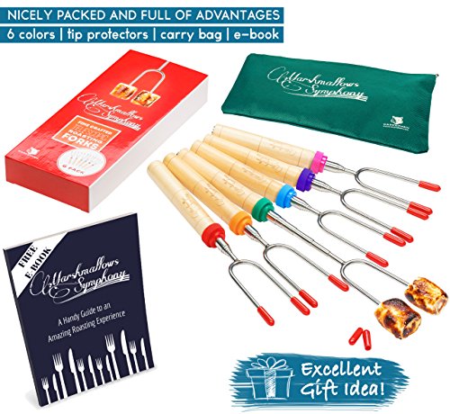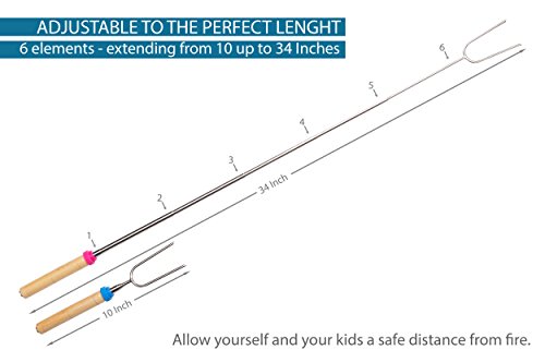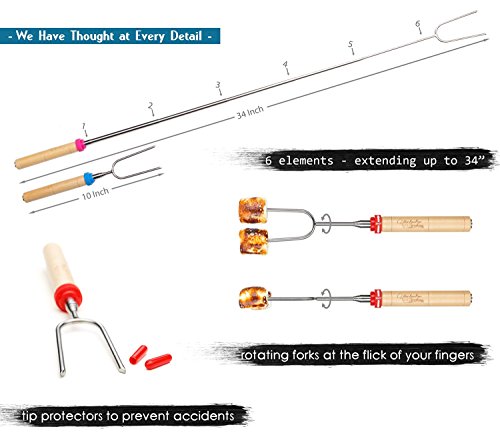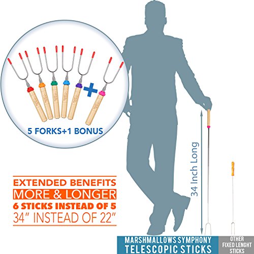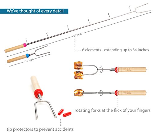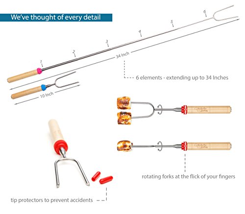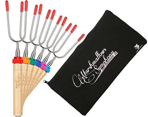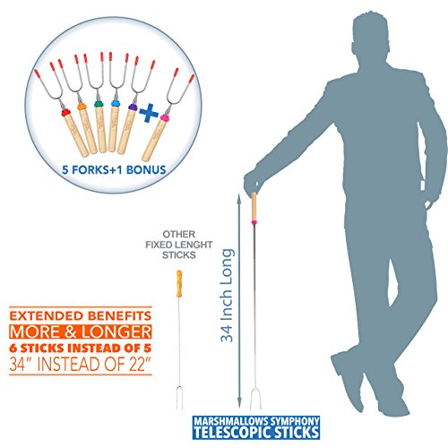 Marshmallows Symphony - Specially-Designed and Fine Crafted with all the right High-Quality features and benefits BUILT-IN -- never have to get too close or too far from the fire - they telescope to the perfect length - much like a radio antenna -- no more twisting your hand in awkward ways, or running the risk of dropping the whole thing in the fire - forks can be rotated independently from handle with just 2 fingers -- enjoy one marshmallow after another, and never worry about burning your hands or your children's delicate fingers - handles are made from wood to be heat resistant -- everyone will have their own color - no more fighting between the kids for who took who's -- spare more time for you and your family - they are so easy and fast to clean -- conveniently deposit and carry them - they are only 10 inches when collapsed -- stay safe from accidentally puncture - safety tips protectors are included