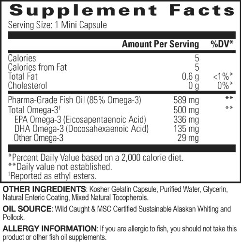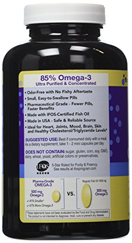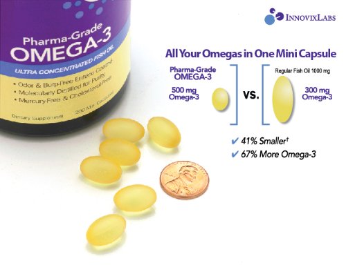 -. Binding : Health and Beauty -. Brand : InnovixLabs -. EAN : 0794504487466 -. Feature : ALL the Omegas you need in one easy-to-swallow, mini capsule. 500mg Omega-3 dosage. 41% SMALLER and 67% MORE Omega-3 than regular fish oil pills. / 85% Omega-3 Pharmaceutical-Grade CONCENTRATION. Verified by multiple third-party testing and IFOS 5-star certification for best in purity, potency, and freshness. / No Fishy Aftertaste, BURP-FREE and ODOR-FREE enteric-coating from all-natural sources. Plus helps to increase absorption. / Made in USA from SAFE and reliable sources. We only use high-grade cold water, wild-caught, MSC-certified sustainable Alaskan fish - Whiting and Pollock. Special molecular distillation process to guarantee purity. Purified free of Mercury, Contaminants and Cholesterol. / Pharmaceutical-strength for benefits for Heart, Joints, Mood, Brain, Skin, and Healthy Cholesterol/Triglyceride Levels.* -. Label : InnovixLabs -. Manufacturer : InnovixLabs -. MPN : F2185B200 -. PackageQuantity : 200 -. PartNumber : F2185B200 -. ProductGroup : Health and Beauty -. ProductTypeName : HEALTH_PERSONAL_CARE -. Publisher : InnovixLabs -. Studio : InnovixLabs -. Title : Pharma-Grade OMEGA-3 (by InnovixLabs). Ultra Concentrated Fish Oil, 500 mg Omega-3 per Pill. Enteric Coated, Odorless & Burp-Free. 200 Mini Capsules. -. UPC : 794504487466