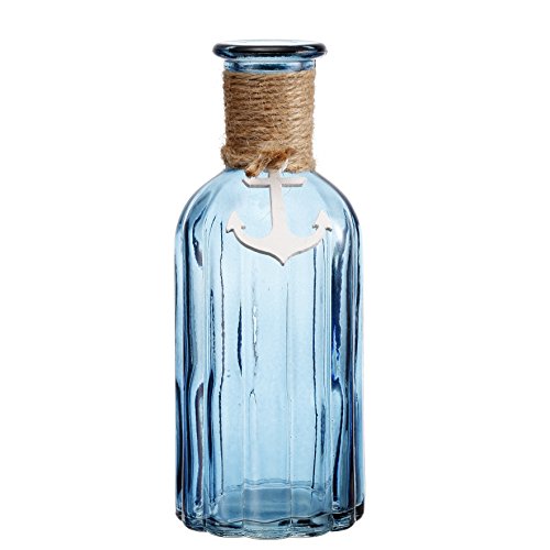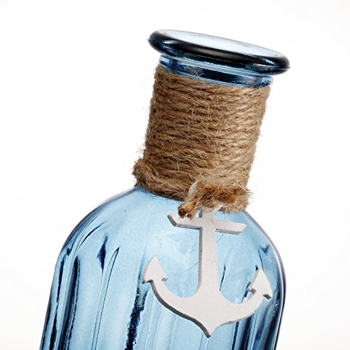 V-More Ocean Blue Flower Bud Vase with Jute Rope and Anchor Glass Bottle with Ribbed Design 7.5-inch Tall for Home Decor Wedding Party and Celebration (Set of 2)