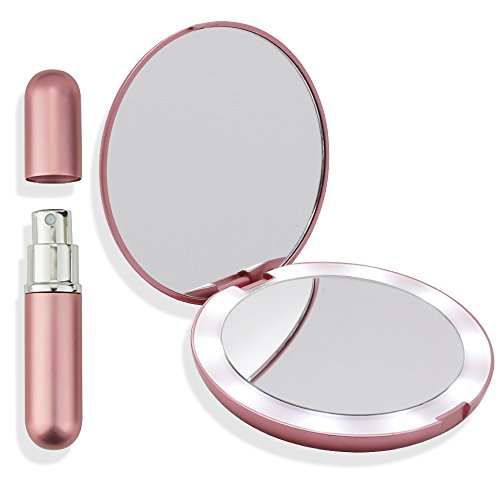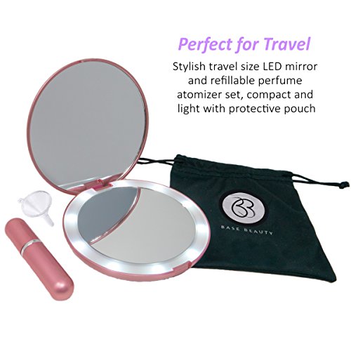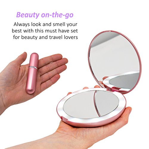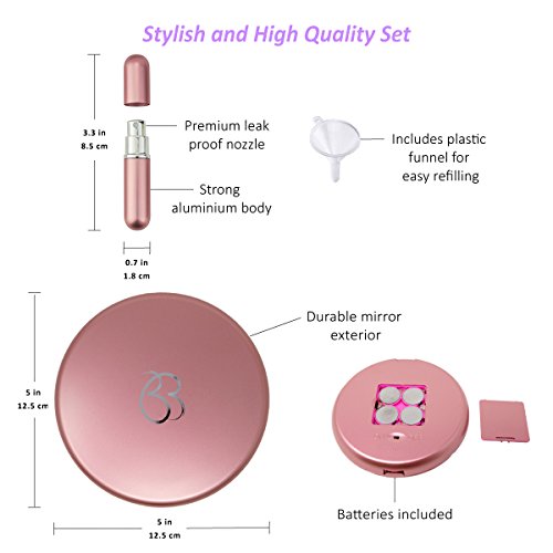 HIGH QUALITY - the LED lighted travel mirror has a durable exterior encasing two mirrors; 1x normal view great for applying and fixing your makeup and hair and 5x magnification perfect for tweezing, blemish control and inserting contact lenses! The perfume atomizer has a simple spill proof screw top which is easy to refill with the plastic funnel included