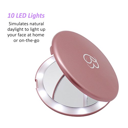 10 LED LIGHTS - this illuminated travel makeup mirror will light up your face to closely simulate natural daylight, hand held and battery operated for ease of use on-the-go or at home, batteries included