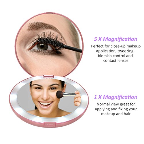 LED Lighted Pink Travel Makeup Mirror, double sided 1X/5X magnifying, portable wireless battery operated, compact foldable illuminated light up hand...
