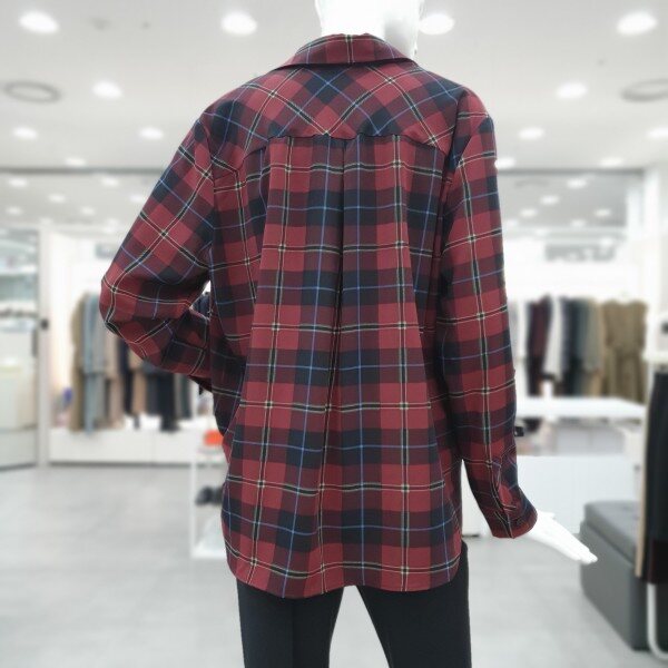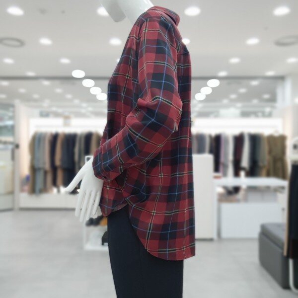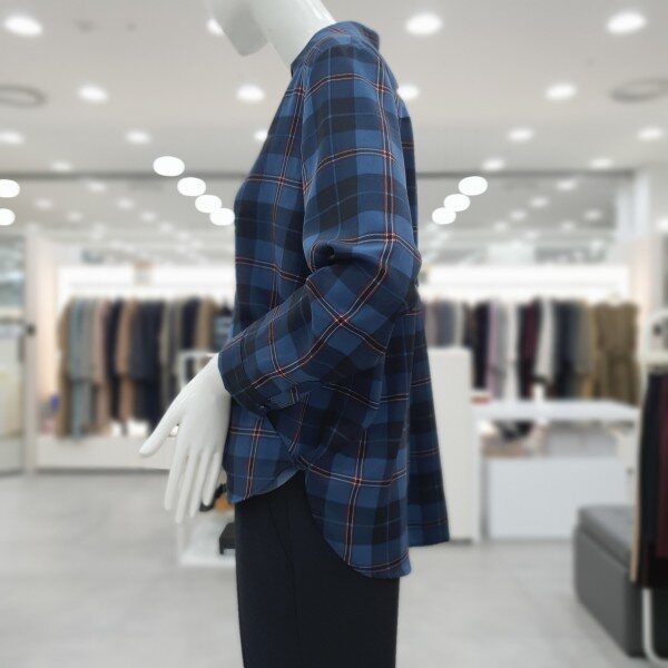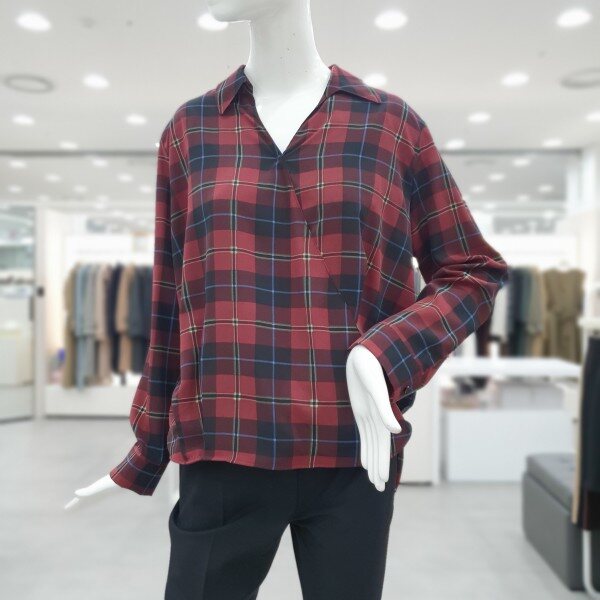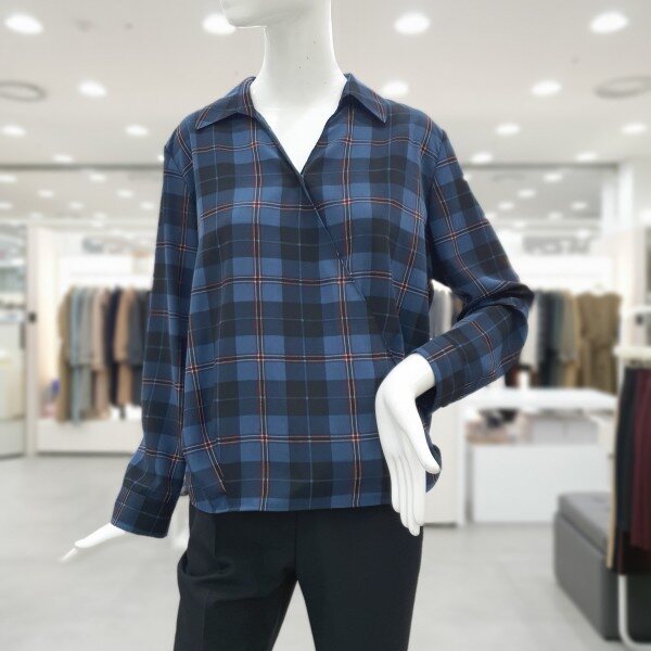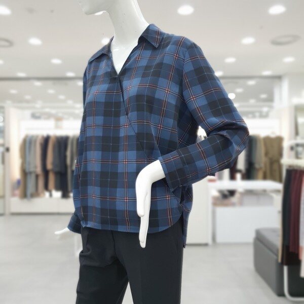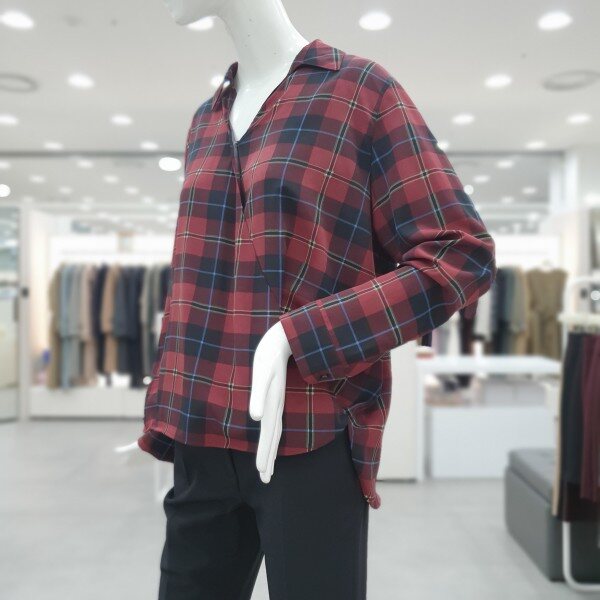 카라 스타일로 트인 느낌을 연출할 수 있는 블라우스입니다. 사선 주름이 잡혀 한층 스타일리쉬하며 체크 패턴을 더해 단품 포인트 코디가 가능합니다. 얇은 원단감으로 부담없으며 원단 자체의 광택감을 즐길 수 있는 제품입니다.