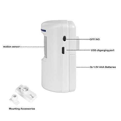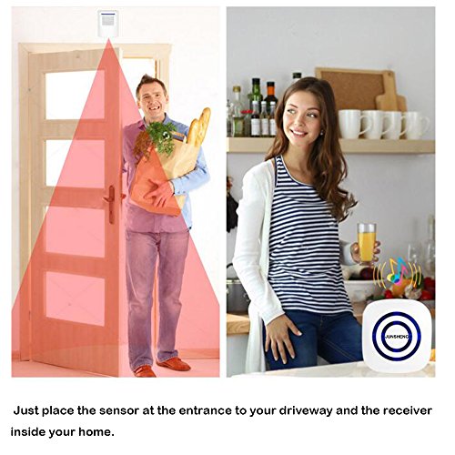 1. 【Easy to Use and Install】-- No fuss and no wiring, just simply insert the batteries (not included), place the wireless motion sensor and alarm receiver wherever you want.The sensor can be placed inside or outside (but needs to be kept away from direct sunlight and rain) while the receiver is plugged into an electrical outlet where you need the sound the most.