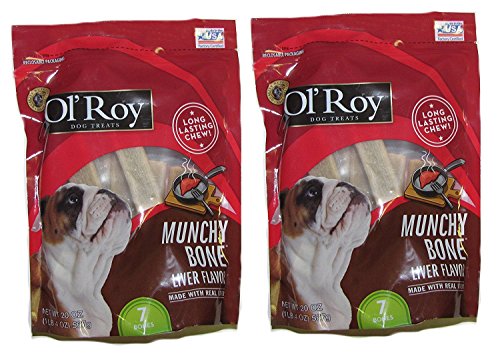 -. Binding : Misc. -. Brand : Ol' Roy -. EAN : 0078742096698 -. Feature : Contains vitamins, minerals and real liver / good for medium and large dogs / long lasting dog chew treats / Each pack contains 7 bones -. Label : Ol' Roy -. Manufacturer : Ol' Roy -. PackageQuantity : 1 -. ProductGroup : Wireless -. ProductTypeName : HOME -. Publisher : Ol' Roy -. Studio : Ol' Roy -. Title : Munchy Bone Liver flavor 20 oz 2 pack -. UPC : 078742096698