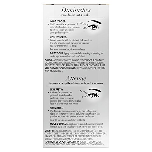 Olay’s best wrinkle-fighting ingredient is now in an eye cream, Olay Eyes Pro-Retinol Eye Cream for deep wrinkles. It fights crow’s feet and smoothes skin to reduce the look of your deepest wrinkles in just 4 weeks. Dermatologically tested, watch your crow’s feet take flight with the Pro-Retinol Eye Treatment.