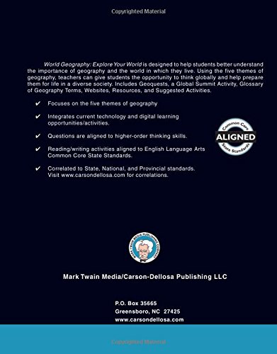 World Geography is designed to help students better understand the importance of geography and the world in which they live. This 128-page resource integrates current technology and digital learning opportunities and activities. Using the five themes of geography, teachers can give students the opportunity to think globally and help prepare them for life in a diverse society. Features reading and writing activities aligned to ELA Common Core, plus includes questions that are aligned to higher-order thinking skills. This book also includes Geoquests, Global Summit Activity, Glossary of Geography Terms, Websites, Resources, and Suggested Activities. Mark Twain Media Publishing Company specializes in providing captivating, supplemental books and decorative resources to complement middle- and upper-grade classrooms. Designed by leading educators, the product line covers a range of subjects including mathematics, sciences, language arts, social studies, history, government, fine arts, and character.
