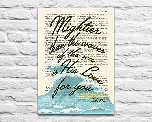 This 5x7 UNFRAMED reproduction print of a highlighted King James Bible scripture is sure to bring encouragement or hope to someone. We scan real pages from old Bibles (thus they have slight flaws and aging such as bleeding words from the other side, because the pages are so thin), which just adds to the character. The highlighted Bible page is in the King James version: "The Lord on high is mightier than the noise of many waters, yea, than the mighty waves of the sea."