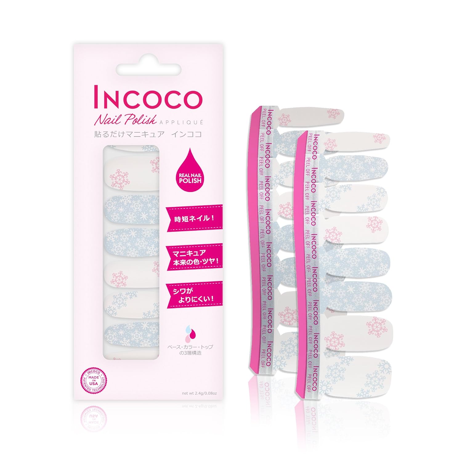 アメリカ生まれの貼るだけマニキュア 「インココ・ネイル・ポリッシュ・アップリケ」(Incoco)はマニキュア成分でできたシートタイプのマニキュアです。乾かす時間不要、塗りムラ知らず、且つマニキュアならではの発色やツヤを楽しめます。インココでまったく新しいマニキュア体験をしてみませんか!【数量限定】ホワイトカラーにパステルの雪の結晶デザイン。強すぎないパステルピンクとブルーのコンビネーションが、冬にピッタリのデザインネイルです。.