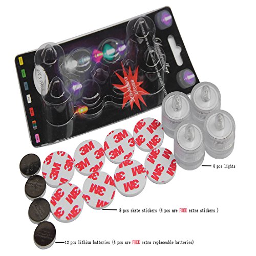 -. Feature : The hottest accessory for longboards, skateboards, and scooters in 2016, these ultra-bright LEDs will light up your board for an amazing look. Light up the night with a choice of various colors and match hues for your own personal glow. / Super lightweight, durable and water resistant---It's not just your friends that will see you coming - whether you're exploring the streets, hitting the skate park, or pulling out new tricks, you'll also be more visible to cars and pedestrians at night. Our lights are also waterproof for perfect results - no matter the weather. / Self-adhesive. Each light includes small, long-lasting, easily replaceable lithium batteries and adhesive.Manual on/off activation---Light up your wheels with easily attachable LEDs placed near the trucks, or create a hover board effect by situating lights closer to the center of your skateboard deck or scooter. There are no bulky battery packs or complex wiring like in other LED products. Just stick and skate! / These lights cast bright, vivid ground effects ,combine different color lights to personalize your style. Works with ALL skateboards,longboards,scooters,buses,bikes. Also suitable for flower arrangements,ponds,decoration for party ,romantic occasions ,making a perfect gift and more. / Skateboard not included---4 pcs lights (come with 8 inner batteries and 4 free batteries, 4 matched stickers and 4 free stickers), 6 pcs lights (come with 12 inner batteries and 6 free batteries, 6 free stickers), 12 pcs lights (come with 24 inner batteries and 12 free batteries,12 free stickers