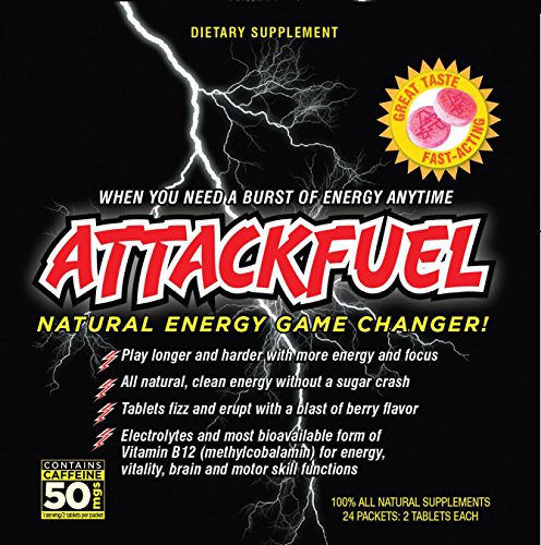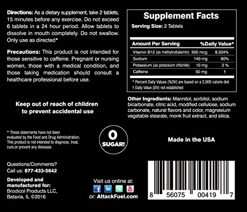 -. Binding : Health and Beauty -. Brand : Creekside Natural Therapeutics -. Feature : All Natural Energy Game Changer for a burst of energy anytime! / Attack Fuel has 50 mgs Caffeine / Enhanced with Electrolytes and the most bio-available form of Vitamin B12 (methylcobalamine) for energy, vitality, brain and motor skill function / Attack Fuel is all natural, clean energy without a sugar crash / Tip: To taste great, let the tablets dissolve (don't chew) and they'll fizz and erupt with a blast of berry flavor -. IsAdultProduct : 0 -. Label : Brodicol Products -. Manufacturer : Brodicol Products -. MPN : 4332492550 -. PackageQuantity : 1 -. PartNumber : 4332492550 -. ProductGroup : Health and Beauty -. ProductTypeName : HEALTH_PERSONAL_CARE -. Publisher : Brodicol Products -. Studio : Brodicol Products -. Title : Attack Fuel-Natural Energy Game Changer Fast Dissolving Tablets